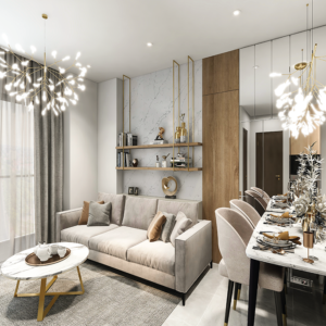 Căn hộ mẫu tại Sales Gallery The Emerald 68 gồm căn hộ 1 PN (47,8 m2) và 2 PN (67,2 m2). Để tăng tính thẩm mỹ, tối đa công năng làm chủ đạo, thiết kế không gian căn hộ mẫu lựa chọn gam màu trung tính, nội thất chất lượng, thông minh giúp tối ưu hóa diện tích và công năng cho mọi thành viên trong gia đình. Theo chia sẻ từ đại diện chủ đầu tư, nội thất căn hộ đều đến từ các thương hiệu cao cấp: Hafele, Kaadas, An Cường …